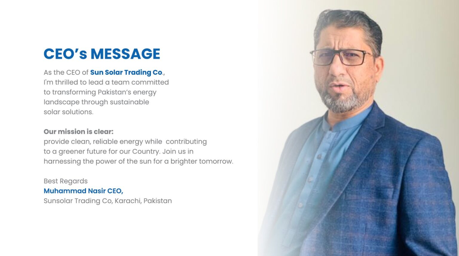 As the CEO of Sun Solar Trading Co., I'm thrilled to lead a team committed to transforming Pakistan’s energy landscape through sustainable solar solutions.
